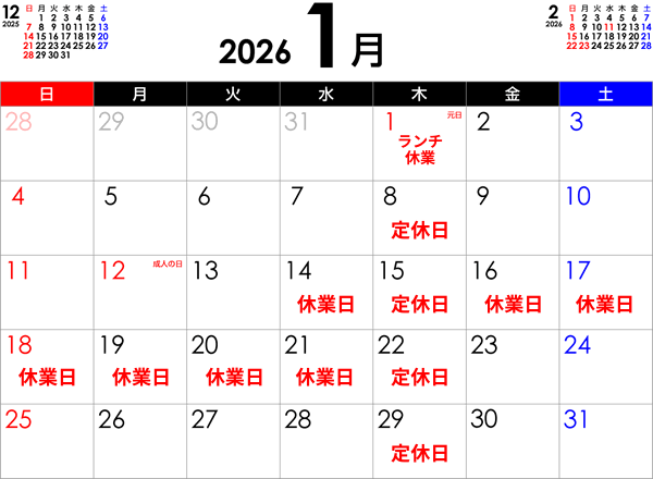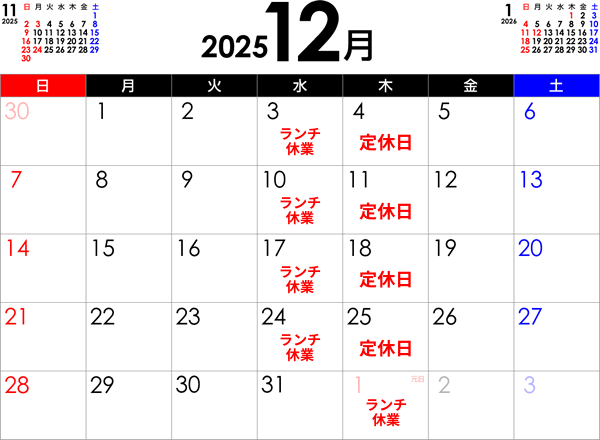 ※年末年始: 12/31通常営業・1/1ランチ休業、ディナーのみ営業・1/2~通常営業